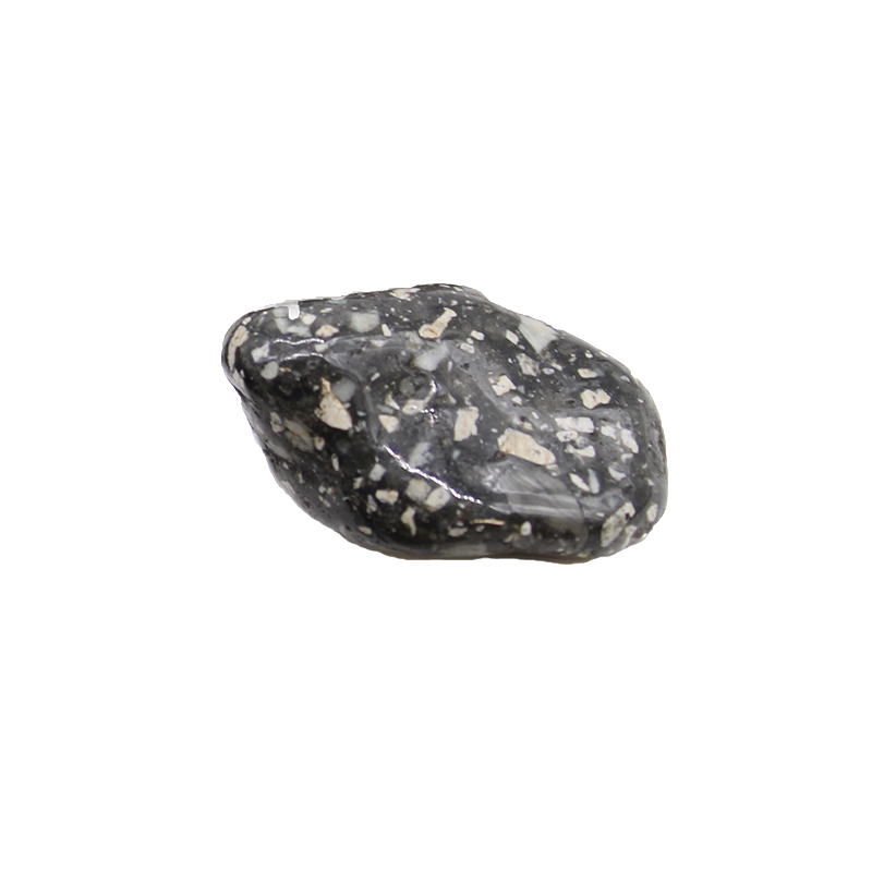 Guinea Fowl Jasper is a black stone with white spots. It resembles the feathers of guinea fowl from the Congo in Africa.